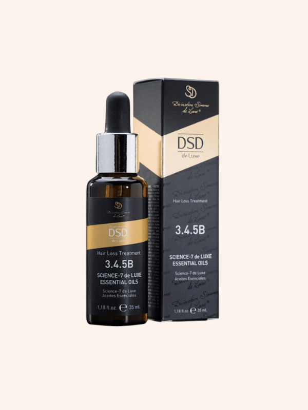 Aceites Esenciales Science7 DSD 35 ml. Esta loción es una mezcla de aceites básicos con aceites esenciales. Aceite de Jojoba, Aceite de semilla de uva, Aceite esencial de lavanda, Aceite esencial de Tomillo, Aceite esencial de Cedro Atlas, Aceite esencial de romero. Este compuesto posee múltiples cualidades, entre las que se encuentran el poder frenar la caída capilar, regular el exceso de sebo y caspa en cuero cabelludo. También aportan hidratación, ejercen acción emoliente a nivel de piel, ayudan a aumentar la cicatrización de pequeñas heridas. Otra de las cualidades de este compuesto es el poder de balancear y equilibrar el pH de la piel, previniendo así la aparición de caspa.