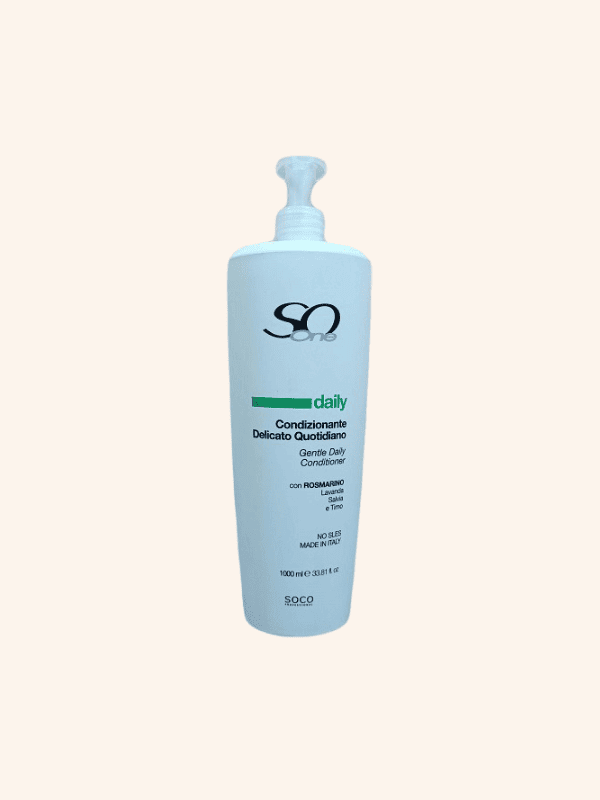 El Acondicionador Daily de uso diario de So one 1000 ml es un producto que está especialmente diseñado para poder usarse de forma diaria. El Acondicionador Daily, debido a su formulación a base de ingredientes nutritivos como la queratina hidrolizada, el colágeno y la vitamina E, es altamente recomendable para su uso en cabellos secos y deshidratados. El uso frecuente del Acondicionador Daily So One devuelve al cabello su suavidad y sedosidad.