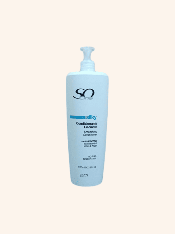 El Acondicionador Silky Alisador So One 1000 ml es un producto para el cuidado del cabello que no contiene sal ni sulfatos. Hidrata y proporciona volumen y vida a los cabellos rebeldes y difíciles de peinar. Contiene Aceite de Argán, Bayas de Goji y Queratina. Para un resultado excelente aplicar el Cristal líquido de So One con semillas de lino y aceite de argán una vez el cabello esté seco y peinado.
