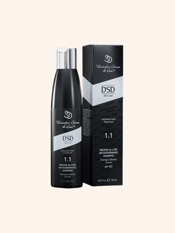 Champú Antigrasa DSD 200 ml. Está basado en queratina y colágeno e incluye extractos de plantas, vitaminas e ingredientes activos sebo-reguladores. Por incluir algunos de sus componentes podríamos citar los derivados de aceite de coco y oliva, pantenol, Pirictone Olamine (acción fungicida), Biotina, Inositol, Castaño de Indias, Mentol, Ácido Salicílico, Extracto de Tepezcohuite, Extracto de granada, Extracto de miel, aminoácidos, enzimas, ácidos orgánicos… Excelente champú antigrasa que no reseca el cabello, al contrario, lo hidrata y lo nutre.
