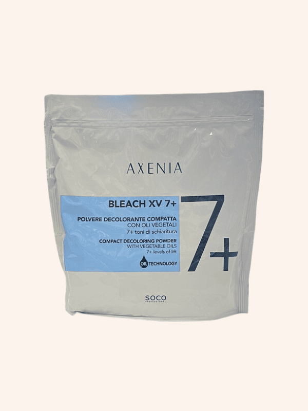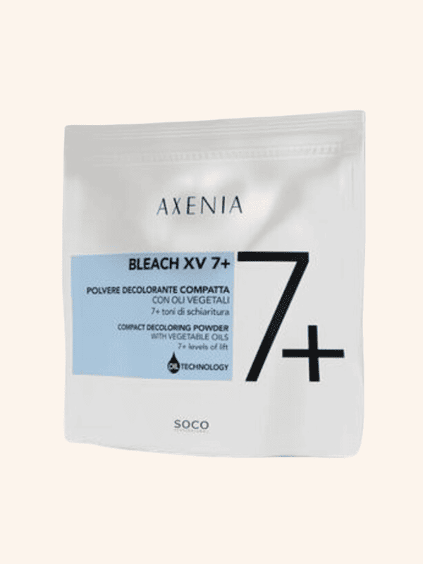 La Decoloración Polvo Azul Axenia XV7 (bolsa 500 gramos) es un polvo decolorante compacto de alto rendimiento diseñado para aclarar más de 7 tonos de forma delicada. Es un producto profesional de la marca italiana Axenia que destaca por su fórmula enriquecida con aceites. Protege la fibra capilar durante el proceso de oxidación. Algunas de sus principales características: