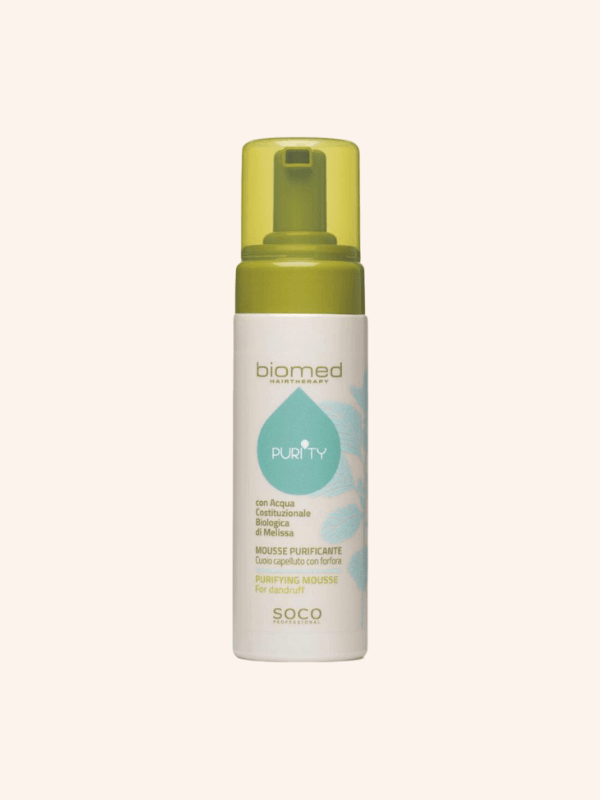 Espuma Purificante Biomed 150 ml. Espuma delicada a base de Agua Celular Biológica de Melisa y Extracto Biológico de Lúpulo. Con activos específicos como Piroctona Olamina y Hexamidina Diisethionate que ejercen una acción antibacteriana y purificante. La Betaína Salicilate ejerce una acción exfoliante pasiva, aportando hidratación al cuero cabelludo. Indicada para cuero cabelludo con tendencia a la caspa.
