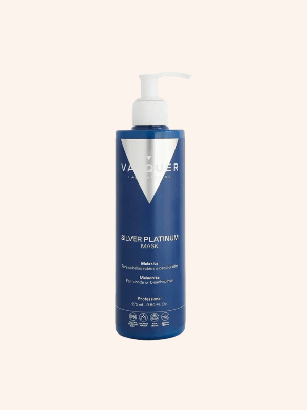 Mascarilla Silver Plata Valquer 290 ml. perfecciona el color de los cabellos decolorados, blancos, grises y plata, a la vez que acondiciona, nutre y repara el cabello. La Malakita y pigmentos plata aportan brillo al cabello neutralizando los colore amarillentos y anaranjados.