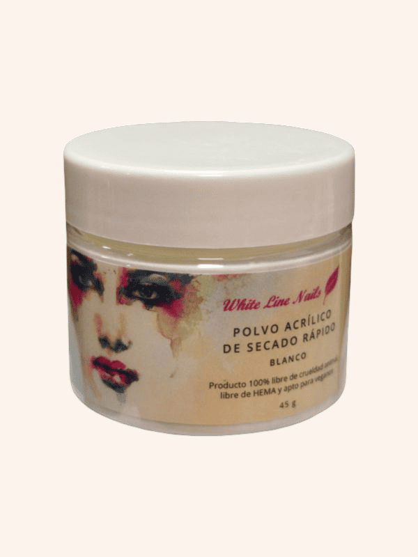 Polvo Acrílico Blanco 45 gr. White Line. Polvo Acrílico de color blanco para mezclar con el líquido acrílico y formar la uña de porcelana. Polvo fino de secado rápido. Este producto es 100% libre de crueldad animal. Es apto para veganos.