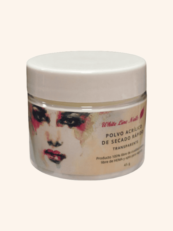 Polvo Acrílico Transparente 45 gr. White Line. Polvo Acrílico de color transparente para mezclar con el líquido acrílico y formar la uña de porcelana. Polvo fino de secado rápido. Este producto es 100% libre de crueldad animal. Es apto para veganos.